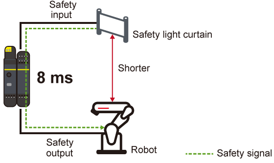 The fast shut off function that enables the safety I/O module to shut off safety output without going through the CPU module realizes a response time of 8 ms. Since similar response time is achieved even with increased I/O points, the safety distance can be shortened even in the large-scale safety system.
