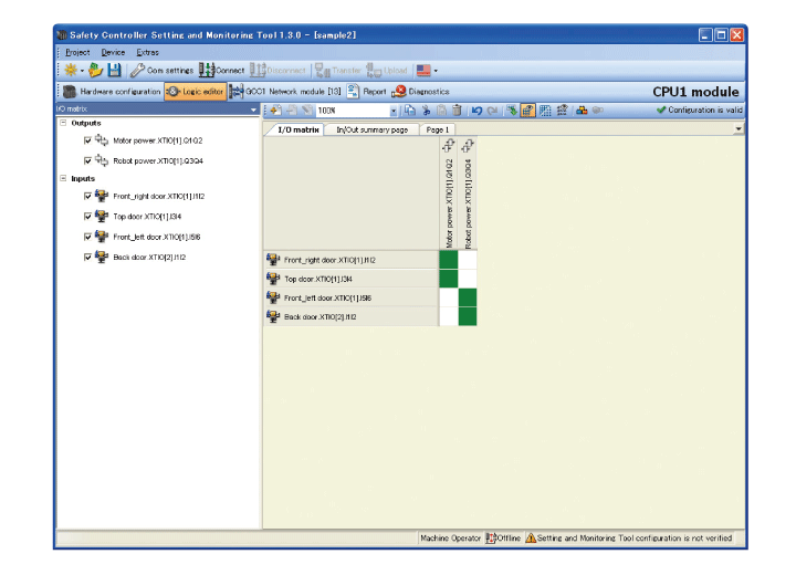 This compact safety controller complies with EN ISO 13849-1 Category 4/PL e and IEC 61508 SIL 3 safety standards. It is ideal for small- to medium-scale safety control system. Safety I/O points can be extended to 144 points per CPU module according to the system configuration. Utilizing the dedicated Setting and Monitoring Tool *1 , setup and logic creation can be easily done.