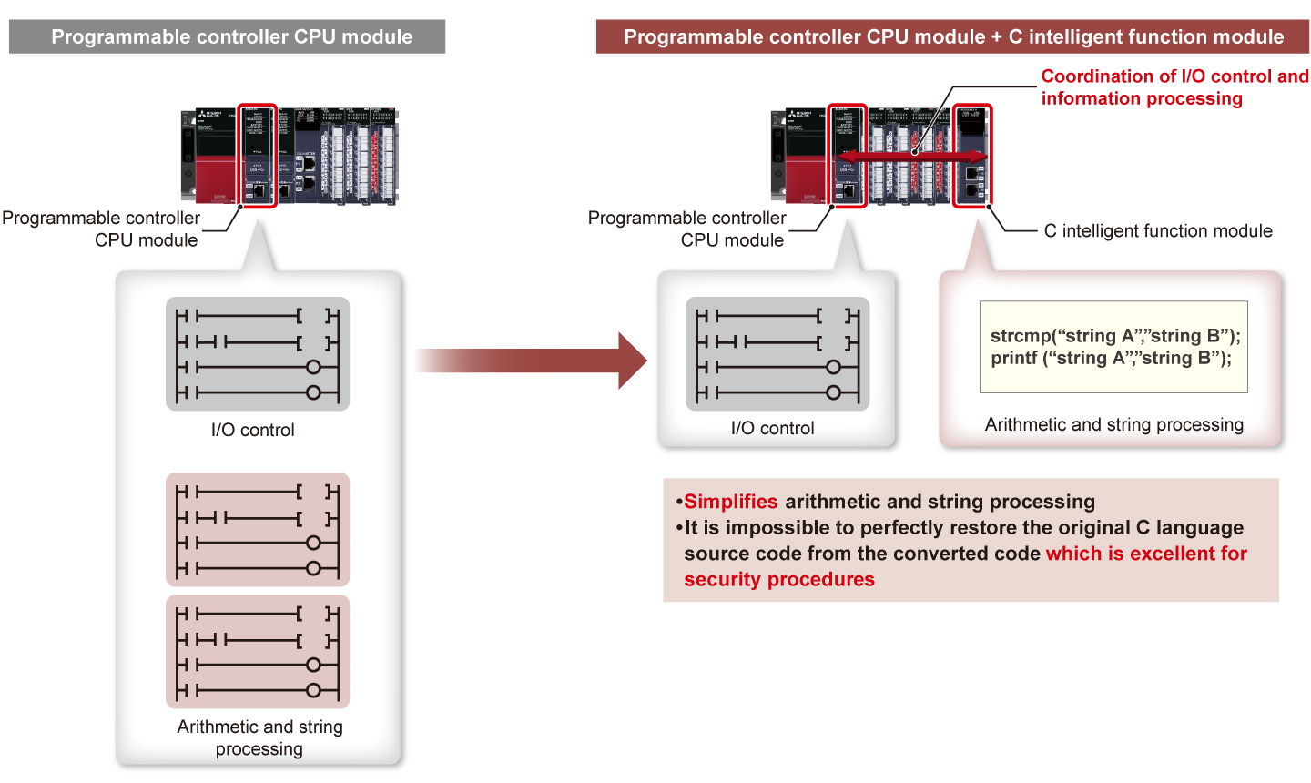 - Intellectual property is simplified by separating it from the ladder program using C Controller module or C intelligent function module, preventing leakage of proprietary technology