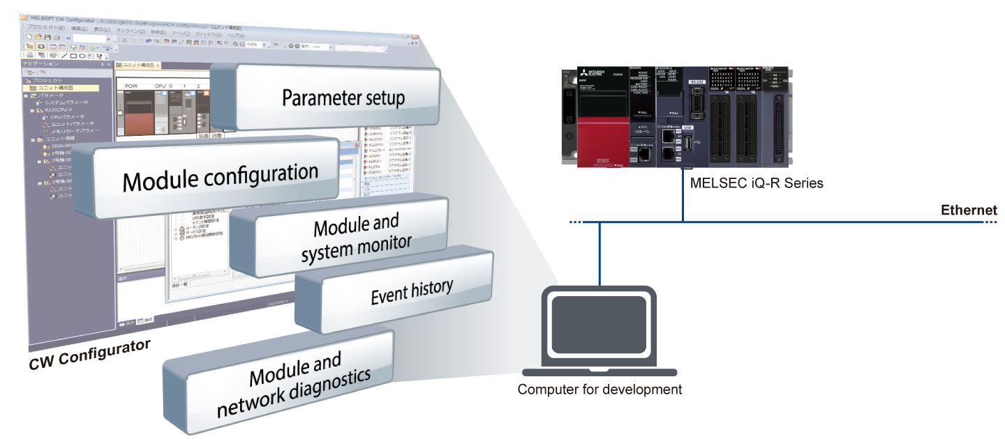 - CW Configurator enables parameter setup, module diagnostics, monitoring, and test of various MELSEC iQ-R/Q Series modules including the C Controller module