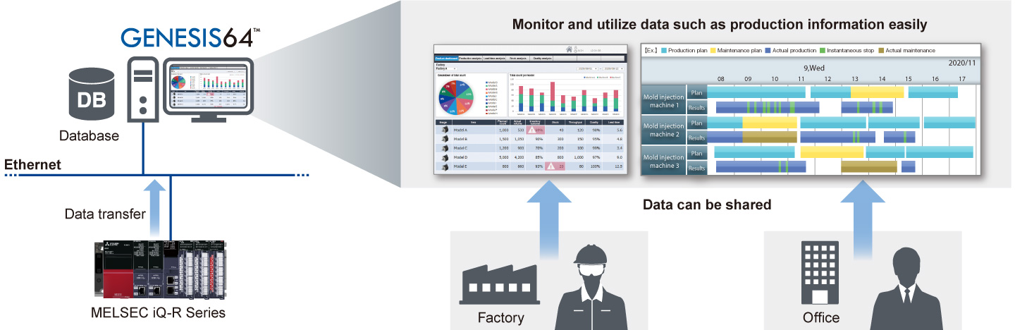- Data in the database can be easily visualized by the extensive compatibility with SCADA software GENESIS64™ and such, data analysis can be utilized for quality control