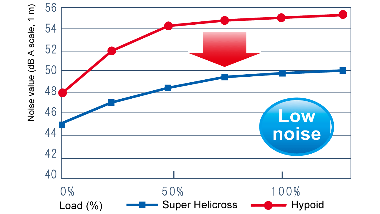 Noise levels compared to right angle shafts (Reduction by 3 to 4 dB compared to the conventional Mitsubishi 0.2-kW model)