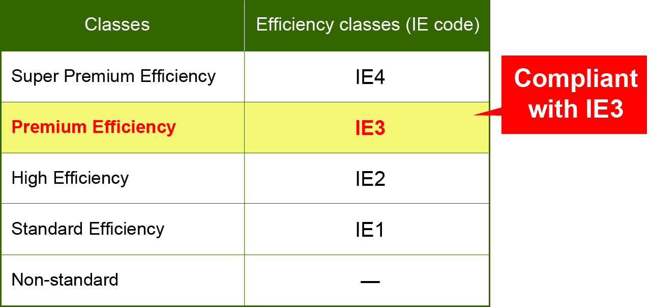 *1: Motor efficiency classes — The Japan Industrial Standards Committee has issued the JISC4034-30, which is based on the International Electrotechnical Commission's IEC60034-30 standard that specifies energy-efficiency classes for single-speed, three-phase, cage-induction motors. (see table at left for categories)