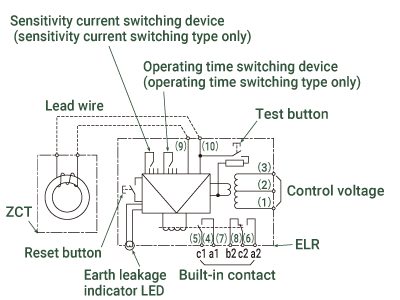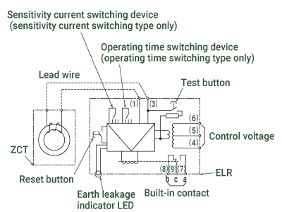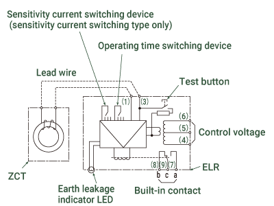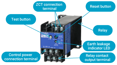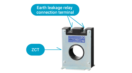 A ZCT (zero-phase current transformer) is used in combination with a relay. The ZCT detects a leakage current, and then the relay sends a signal.