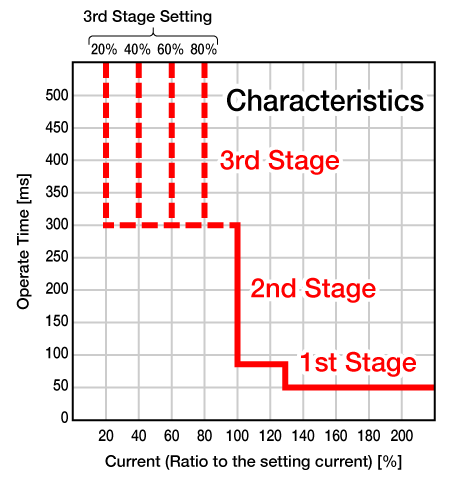 Three stage OCR elements are provided. 3rd stage is added to the instantaneous function of OCR. 3rd stage OCR can operate with a current (4 steps of 20 to 80%) less than the instantaneous element, making it easy to coordinate the protection system of distribution substations. Minimum setting value of Vo of DGR is expanded to 2%, with enables higher sensitivity for ground fault.