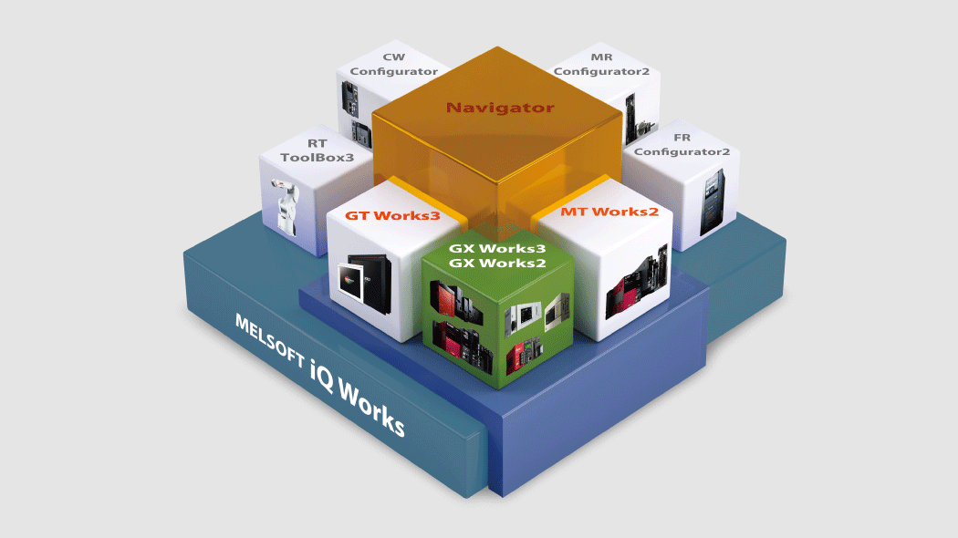 MELSOFT iQ Works is an integrated software suite consisting of MELSOFT GX Works3, MT Works2, GT Works3, RT ToolBox3 mini, FR Configurator2 which are programming software for each respective product. Integration is further enhanced with MELSOFT Navigator as the central system configuration incorporating an easy‑to‑use, graphical user interface with additional project-sharing features such as system labels and parameters. The advantages of this powerful integrated software suite are that system design is made much easier with a substantial reduction in repetitious tasks, cutting down on errors while helping to reduce the overall TCO.