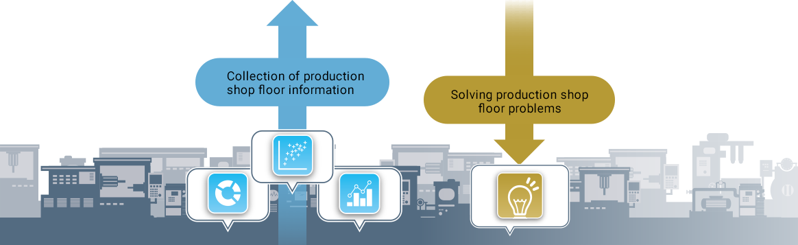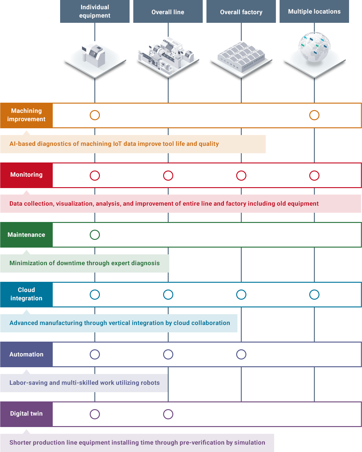 We provide our customers with extensive DX solutions that utilize data collection from a variety of of machine tools and devices, AI-driven data analysis, simulations to improve engineering efficiency, and cloud integration for overall system optimization.