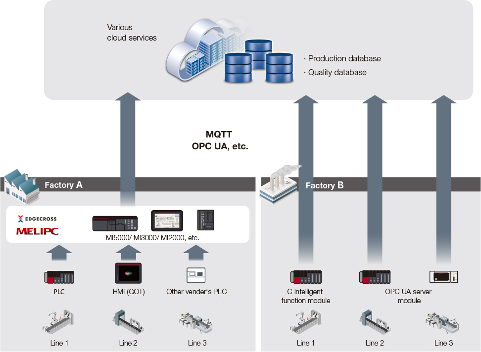 (1) Equipment operation information and quality information are collected via the various modules of Edgecross and PLCs.