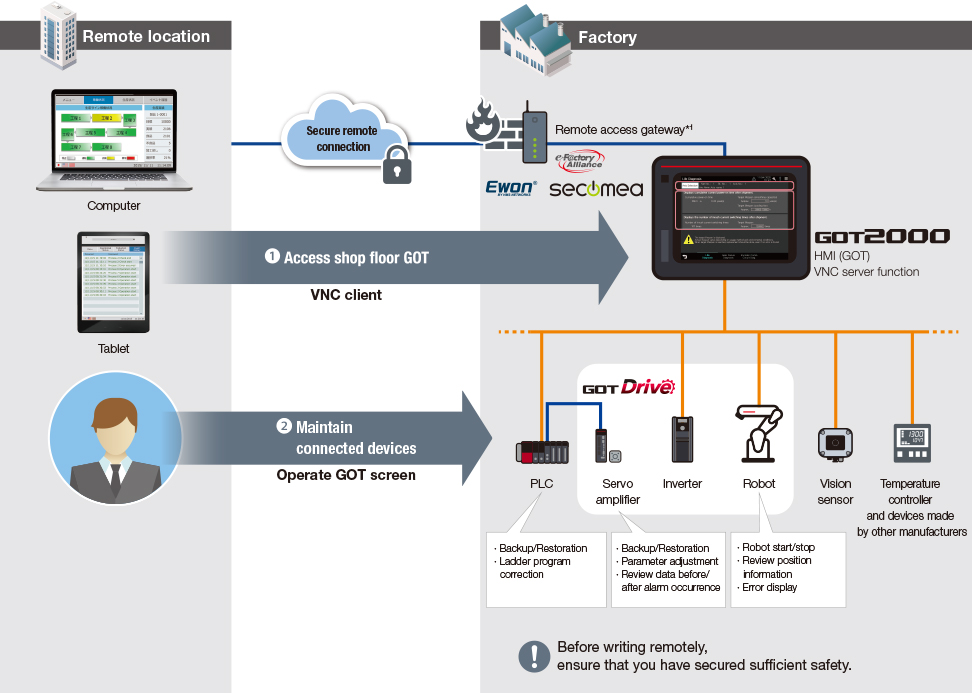 (1) The VNC server function of the GOT2000 Series enables users to display and operate GOT screens "as is" using a VNC client at remote locations.