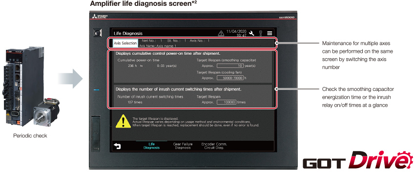 Using the GOT Servo Amplifier Life Diagnosis function, it is possible to check the accumulated energization time of smoothing capacitors and the number of times the inrush relay has been turned on and off, therefore helping users understand when servo amplifiers need to replaced.