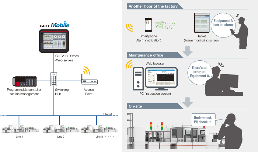 The GOT Mobile function makes it possible to view information collected by GOTs on-site from information devices such as PCs and tablets in remote locations. The operation status, error status, etc. of multiple lines installed at a factory can be monitored remotely without being on site. Users can also use Pocket GOT, a mobile application for GOT, to receive notifications of user alarms that are occurring on monitored GOTs to mobile devices.