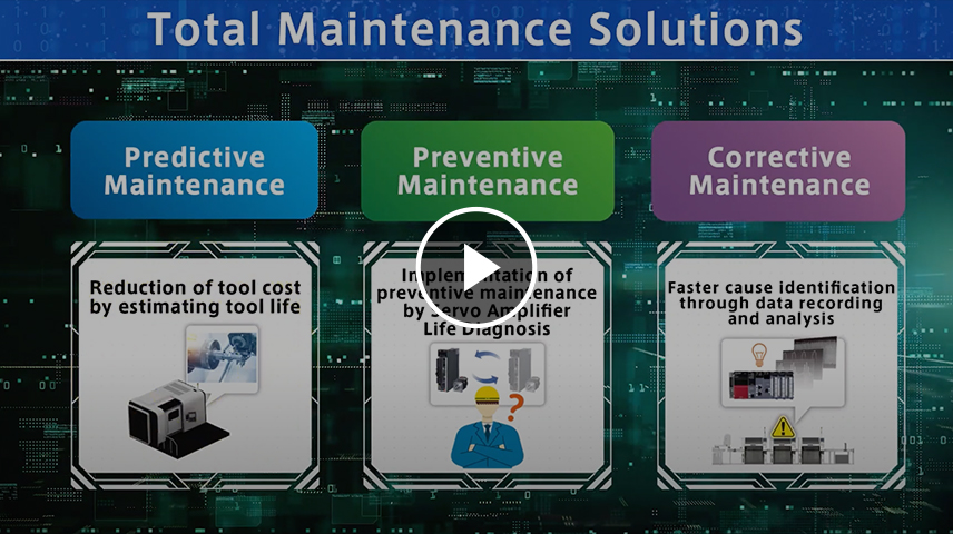 Total Maintenance Solutions comprise of "Predictive Maintenance", which prevents problems before they arise by detecting signs of abnormalities based on data collected, "Preventive Maintenance", which enables planned maintenance by managing data regarding operating times and frequencies, as well as "Corrective Maintenance", which shortens the time spent on cause investigation and ensures the early recovery of equipment by utilizing historical data.