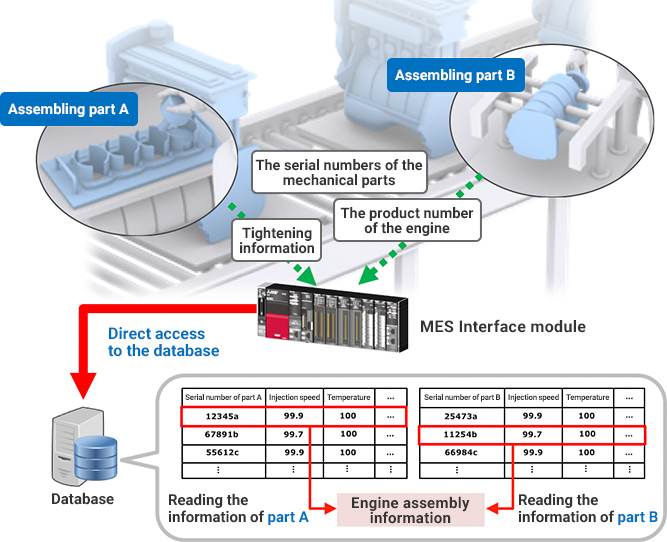 Realize traceability by linking the engine assembly information and mechanical part information collected by the MES Interface module in a database.