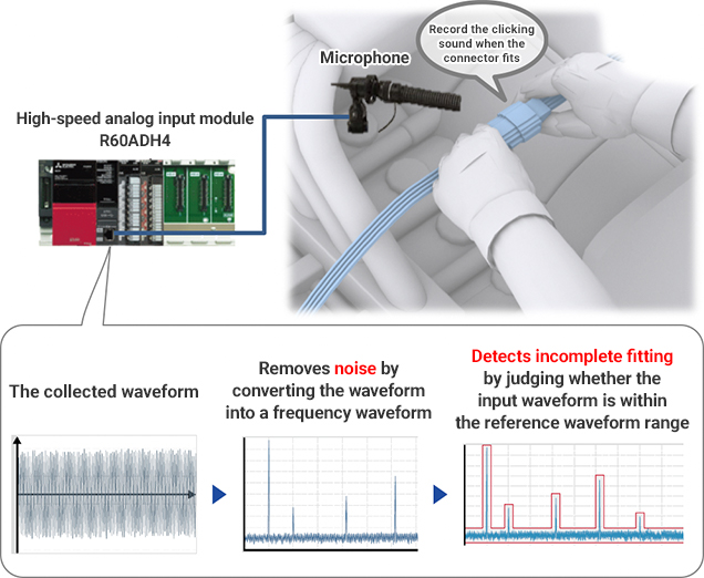 Improving quality by preventing incomplete fitting of connectors | Collect noise during fitting with a high-speed analog input module and perform FFT analysis with a PLC. |
