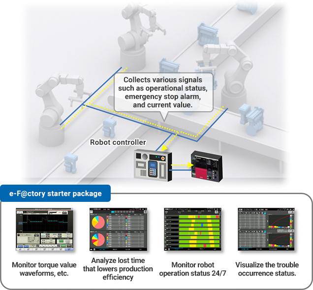 Performing preventive maintenance by monitoring the operational status of robots | Visualize the operational status of robots with e-F@ctory starter package. |