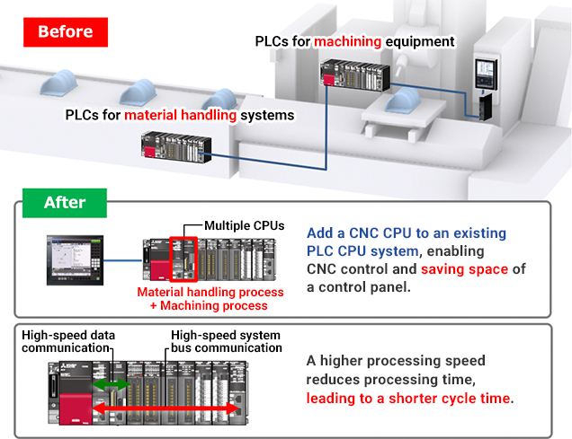 Improving cycle time and reducing control panel size through space saving by controllers(PLCs/CNCs) | Configure a multiple CPU system by PLC CPUs and CNC CPUs. |