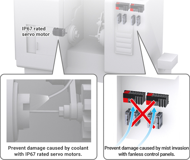 Preventing damage to servo motors caused by coolant during machining | Enhance water resistance with IP67 rated servo motors and fanless control panels. |