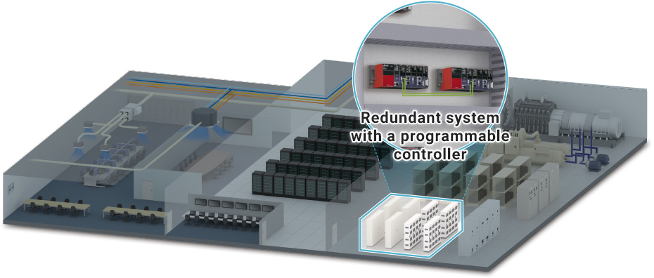The MELSEC redundant system ensures the reliability of critical equipment, such as chillers, that cannot be shut down during data center operations. The system is built with general-purpose products, therefore it can be easilymaintained and updated after installation.