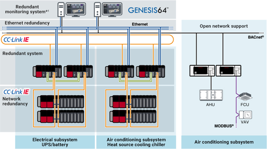 Products of the MELSEC iQ-R/iQ-F series make it possible to build a highly flexible air conditioning system utilizing BACnet ® , which is a common network in the building market. The iQ-R series duplicates each layer of monitoring (SCADA) and the controller network, and also supports a redundant system securing high reliability.