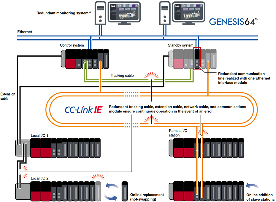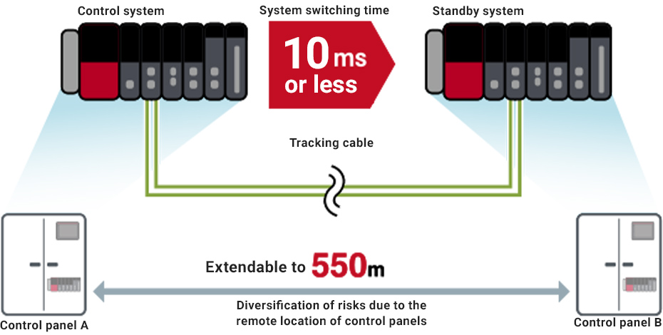 By connecting a tracking cable capable of extending the distance between the redundant systems to 550 m, the control system and the standby system can be separated. It can be placed far away on the control panel. The optical fiber cable of the tracking cable is not affected by noise and enables high-speed data communication. The system switching time is reduced to 10 ms or less, and high-speed system switching from the control system to the standby system enables continuous control with higher reliability.