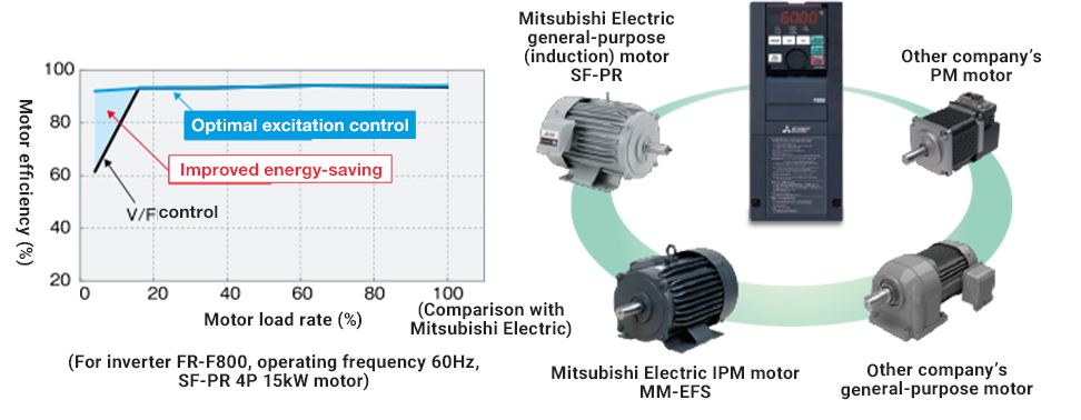 The optimal output characteristics (V/F characteristics) can be selected to suit the application and load characteristics, and the inverter automatically streamlines motor control without the need for detailed parameter settings. In addition, it has a built-in auto-tuning function that measures the circuit constant of the motor, enabling stable motor drive even if wiring length is long or differences exist between individual motors. Furthermore, the use of an optimal excitation control mode that enables maximum motor efficiency reduces wasteful motor loss, minimizes power consumption, and achieves good cost-effectiveness.