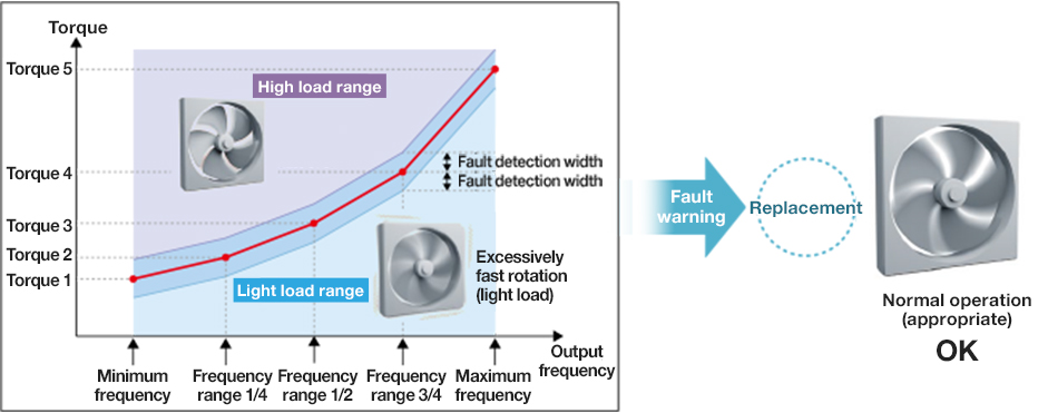Users can store the relationship between speed and torque without failure, compare the current load condition with the stored failure characteristics, and output an error/warning when out of the normal range. It can detect abnormalities such as filter clogging and belt breakage, making maintenance easier.