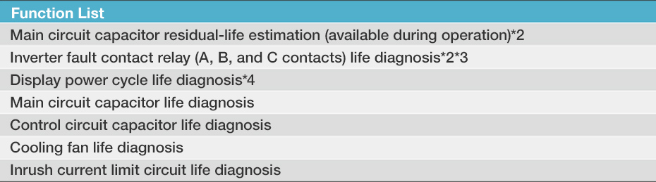 Availability of life diagnosis checks is extended as compared to the FR-E700 series. This enhanced diagnosis function ensures reliable operation of the system. The design life of cooling fans and capacitors has been extended to 10 years *1 .