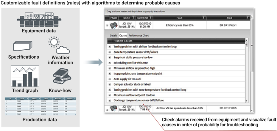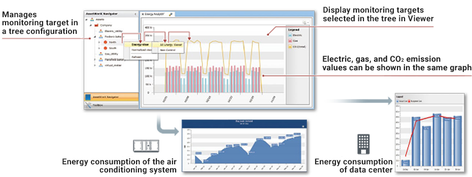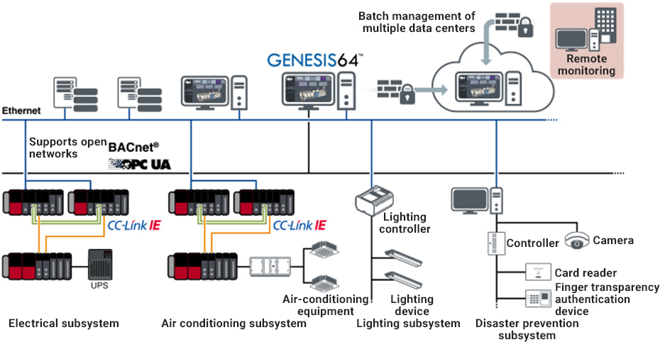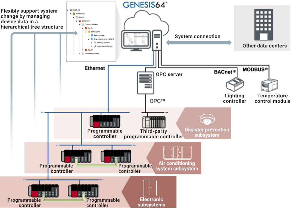 GENESIS64™ works with other IT tools and Microsoft® applications, helping customers lower their total cost of ownership by providing a single data utilization platform for internal and external information coordination. In addition, OPC™, MODBUS®, and BACnet® can be used as standard equipment to easily connect to various systems and reduce connection costs.