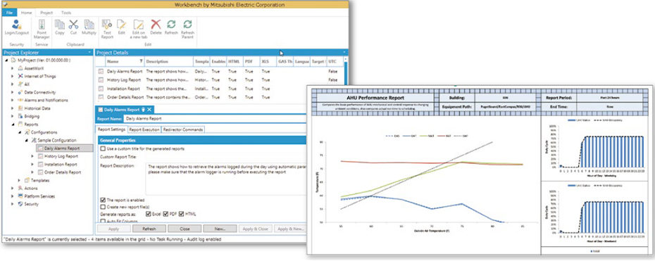 From the various data accumulated on the server, GENESIS64 can automatically output forms for various periods of time (daily reports/weekly reports/monthly reports/yearly reports, etc.) and each piece of equipment. In addition to Excel®, files can be outputted in HTML or PDF, and users can choose the display method of their choice from a variety of tables and graphs.
