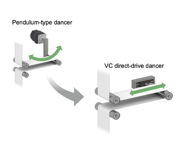 - Tension fluctuation suppression and tension accuracy improvement can be achieved by employing VCM (Voice Coil Motor) in the dancer roll pressurization mechanism.