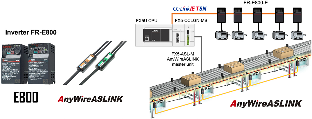 Easy of use and variable speed operation | Simultaneous speed change and real-time collection of production site data through FR-E800 and the CC-LinkIE TSN network |