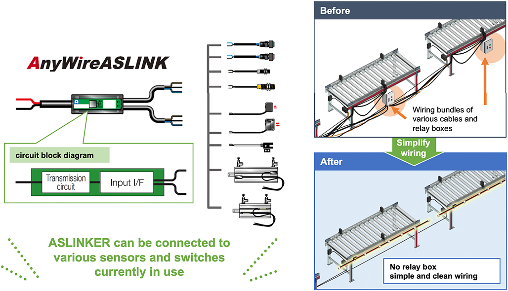 Reduction of line start-up man-hours | AnyWireASLINK simplifies wiring and eliminates the need for relay boxes which leads to reduction of miswiring, easy start-up and expansion of lines. |