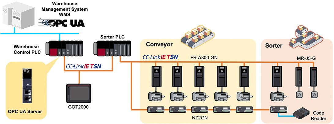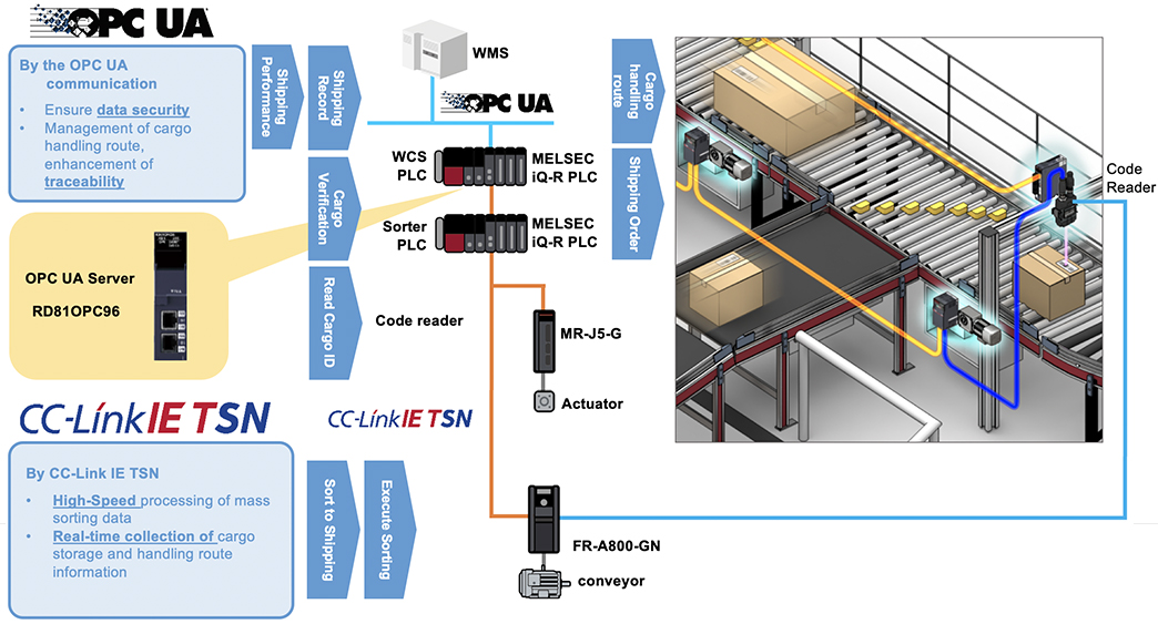 Real-Time processing of cargo sorting data by CCLink IE TSN communication.Safe and Reliable traceability is achieved by OPC UA communication between the WCS and WMS |