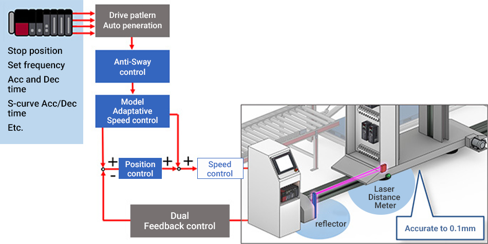 Controller programming is not required, and the processing load of the controller is reduced only by setting basic conditions for positioning in the inverter. In case of failure, positioning can be adjusted only by inverter parameters.
