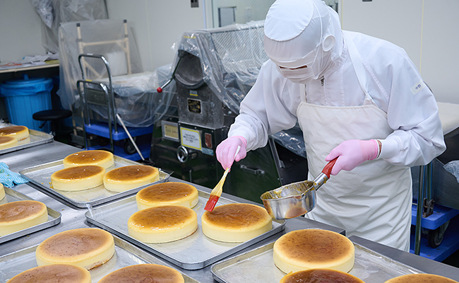 Famiel Confectionery sells a variety of cakes to hotels and restaurants nationwide in Japan. The photo above shows the process of spreading jam on baked cheesecakes.
