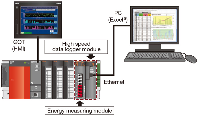 - Cho phép hiển thị đồ họa dễ dàng về mức tiêu thụ năng lượng cụ thể với một GOT (HMI) được lắp đặt trên bảng điều khiển tại địa điểm sản xuất.