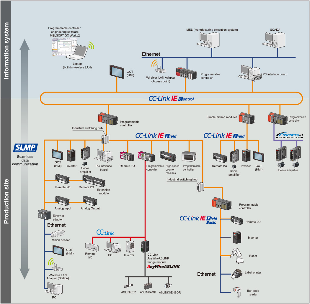 Enhanced information communication by networking is the essential requirement in the automation industry. The MELSEC-Q Series provides an open and seamless network environment integrating the following different level of automation networks: CC-Link IE; high-speed and large capacity Ethernet-based integrated open network that connects shop floor and IT system as the core of e-F@ctory, CC-Link; SEMI certified global standard network originating from Japan and Asia, and AnyWire; sensor level distributed control network.