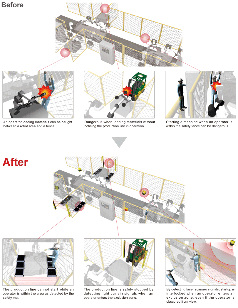 Dựa trên nguyên tắc tách biệt máy móc khỏi người vận hành, các biện pháp bảo vệ an toàn đã được thực hiện dựa trên đánh giá rủi ro và kiểm soát an toàn như việc thực hiện dừng khẩn cấp. Sự tiến bộ của công nghệ thực hiện các hoạt động như giảm tốc độ vận hành khi người vận hành tiếp cận máy móc và hoạt động liên tục mà không dừng lại khi người vận hành rời khỏi máy. Khái niệm an toàn đã chuyển sang một mức độ mà ở đó người vận hành và máy móc có thể làm việc cùng nhau, đảm bảo an toàn cao hơn. Mitsubishi Electric cung cấp giải pháp an toàn tổng thể, hiện thực hóa "sự hợp tác" giữa người vận hành và máy móc với nhiều sản phẩm đa dạng.