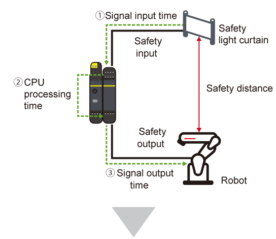 Chức năng ngắt nhanh cho phép mô-đun I/O an toàn ngắt đầu ra an toàn mà không cần qua mô-đun CPU đạt được thời gian phản hồi 8 ms. Vì thời gian phản hồi tương tự được đạt được ngay cả khi tăng số điểm I/O, khoảng cách an toàn có thể được rút ngắn ngay cả trong hệ thống an toàn quy mô lớn.