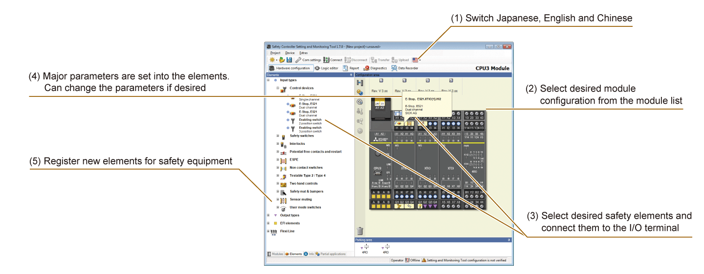 - *7. Các tham số kết nối của thiết bị an toàn chính, chẳng hạn như công tắc dừng khẩn cấp, công tắc cửa an toàn và rèm ánh sáng an toàn, được biểu thị bằng một biểu tượng. Thực hiện cài đặt một cách đơn giản bằng cách kéo và thả. Các thành phần cho thiết bị an toàn của các đối tác của Mitsubishi cũng có sẵn. Vui lòng liên hệ với đại diện Mitsubishi địa phương của bạn.
