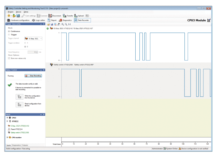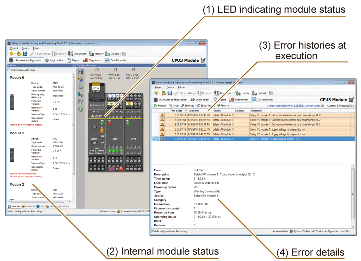 Trạng thái ON/OFF của tín hiệu đầu vào an toàn và tín hiệu đầu ra an toàn được xử lý bởi bộ điều khiển an toàn có thể được lưu trữ. *8 Kết quả được ghi lại trên Công cụ Cài đặt và Giám sát cũng có thể được xem trên máy tính để sử dụng cho việc khắc phục sự cố.