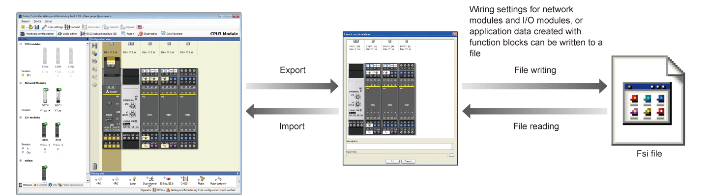 Cài đặt kết nối đến các mô-đun I/O hoặc logic ứng dụng được tạo ra bằng các khối chức năng có thể được lưu trữ trong một tệp cài đặt duy nhất, và dữ liệu có thể được đọc từ các tệp cài đặt đã lưu.