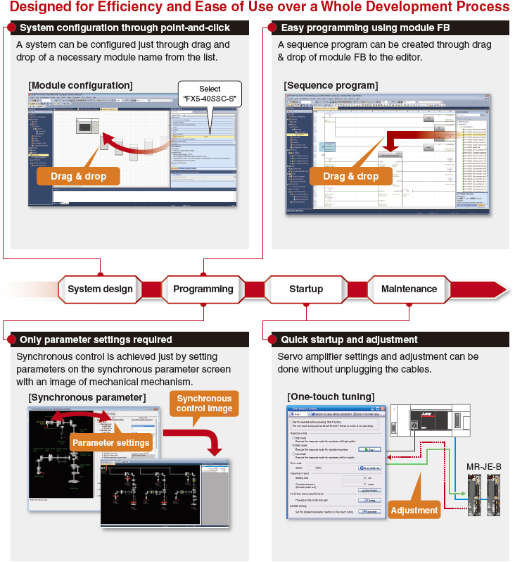 Phần mềm này hỗ trợ toàn bộ chu trình phát triển sản phẩm - tạo, khởi động, gỡ lỗi và bảo trì các chương trình tuần tự, tham số, dữ liệu vị trí/cam.