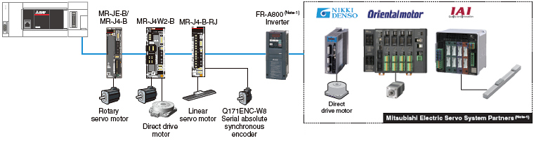 Không chỉ động cơ servo quay mà còn động cơ servo tuyến tính, động cơ truyền động trực tiếp, biến tần dòng FR-A800, và các sản phẩm của các đối tác hệ thống servo Mitsubishi Electric cũng có thể kết nối.