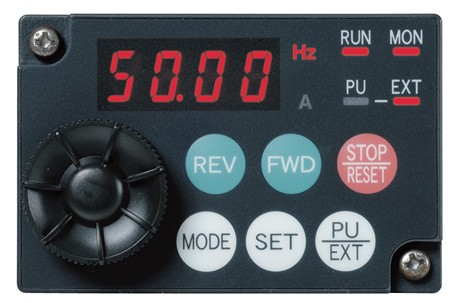 Bảng điều khiển cho phép vận hành biến tần và giám sát cài đặt tần số từ bề mặt vỏ.