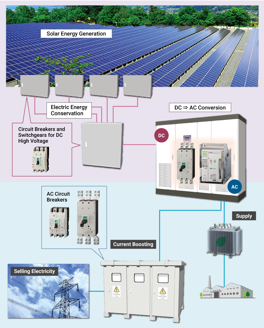 Một thiết bị chuyển đổi điện DC được tạo ra bởi các mô-đun pin mặt trời thành điện AC phù hợp cho việc sử dụng trong các nhà máy và hộ gia đình. Lắp đặt một máy cắt điện DC cao áp ở phía đầu vào (mạch DC) và một máy cắt điện AC ở phía đầu ra (mạch AC).