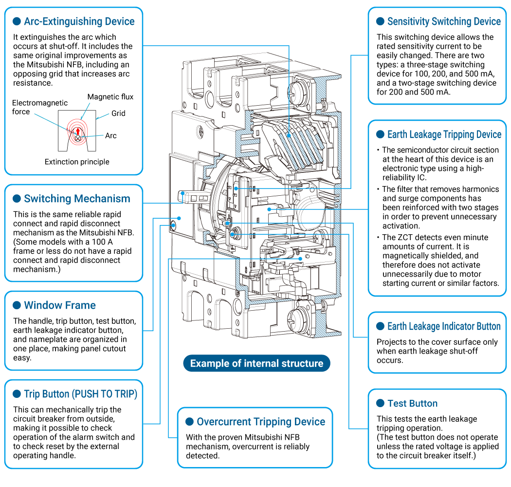 Viết tắt phổ biến của nó là ELCB (Bộ ngắt mạch rò điện), và nó được chỉ định là “NV” trong các tên model của công ty chúng tôi.