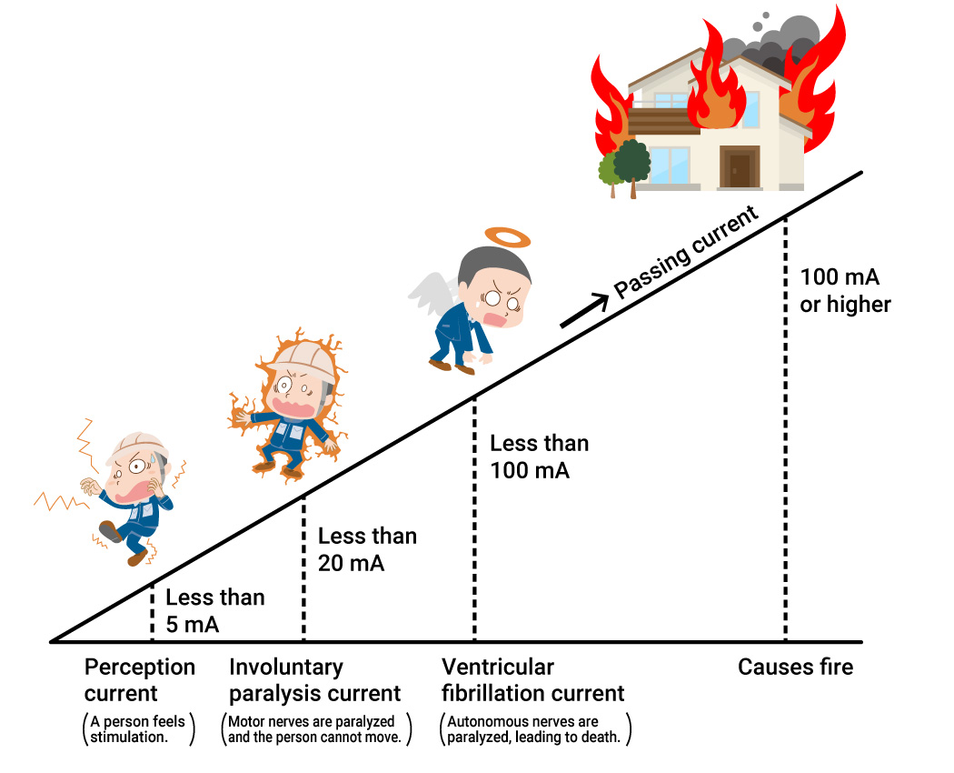 Một người cảm thấy tê khi dòng điện dưới 5 mA được áp dụng vào cơ thể con người, tuy nhiên khoảng này không gây ra tác động đe dọa đến tính mạng. Khi dòng điện từ 5 mA đến 20 mA được áp dụng, các dây thần kinh vận động bị liệt và người đó không thể di chuyển. Nếu tình trạng này tiếp tục, nó sẽ đặt người đó vào nguy hiểm. Khi dòng điện từ 20 mA đến 100 mA được áp dụng, các bất thường trong chức năng tim xảy ra, và điều này đe dọa đến tính mạng của người đó. Dòng điện rò từ 100 mA trở lên có thể gây ra cháy. Bộ ngắt mạch rò điện phát hiện rò điện khoảng 15 đến 30 mA, và ngay lập tức ngắt mạch trong vòng 0.1 giây, ngăn ngừa tai nạn.
