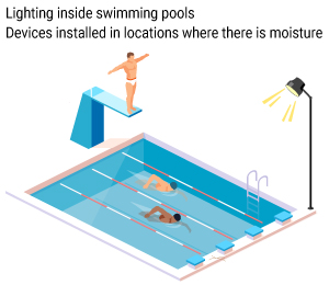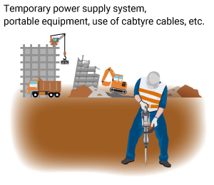 Để ngăn ngừa tai nạn do rò điện, các luật và quy định quy định các vị trí mà bộ ngắt mạch rò điện phải được lắp đặt. Như được thể hiện trong hình dưới đây, trong các trường hợp như khi một thiết bị điện được sử dụng ở nơi có độ ẩm hoặc nước, hoặc khi một thiết bị cầm tay chạy bằng động cơ được sử dụng ở nơi có độ dẫn điện cao như tấm sắt hoặc khung sắt, một bộ ngắt mạch rò điện là cần thiết.