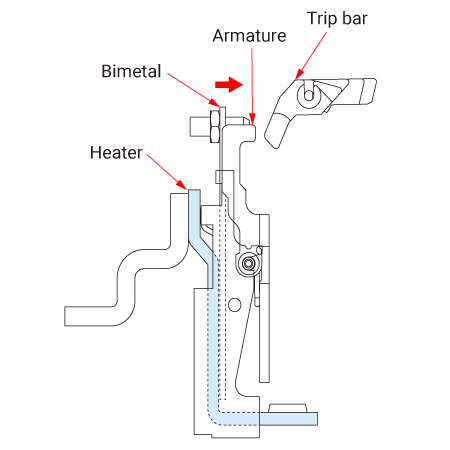 - Hoạt động ngắt mạch theo thời gian trễ Khi dòng điện quá mức chạy qua, kim loại kép sẽ bị quá nhiệt, uốn cong theo hướng mũi tên chỉ và di chuyển thanh ngắt.